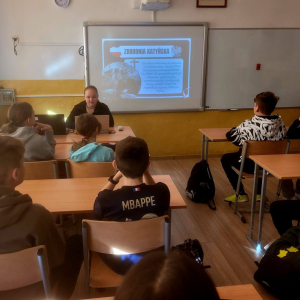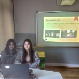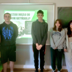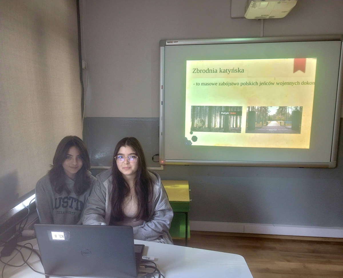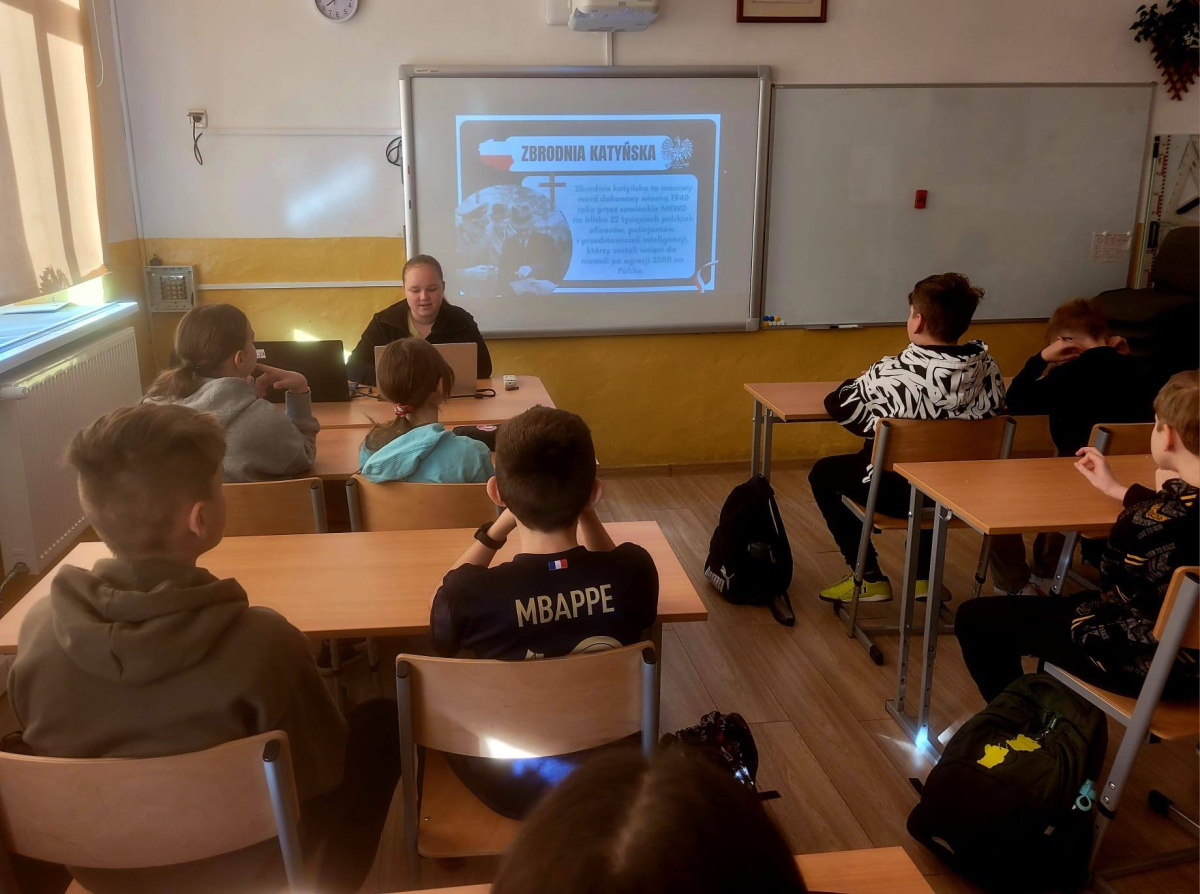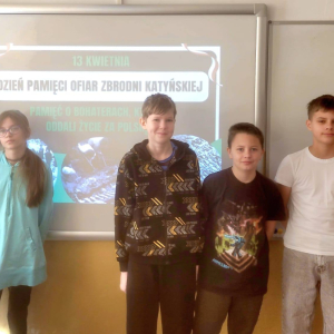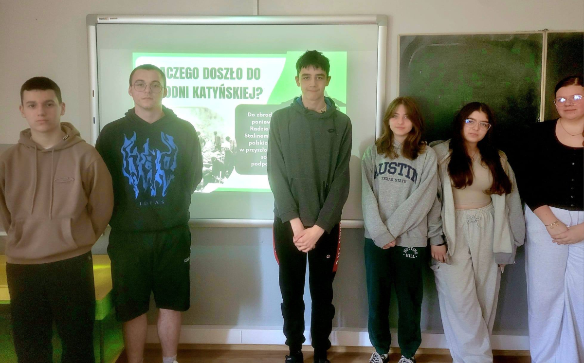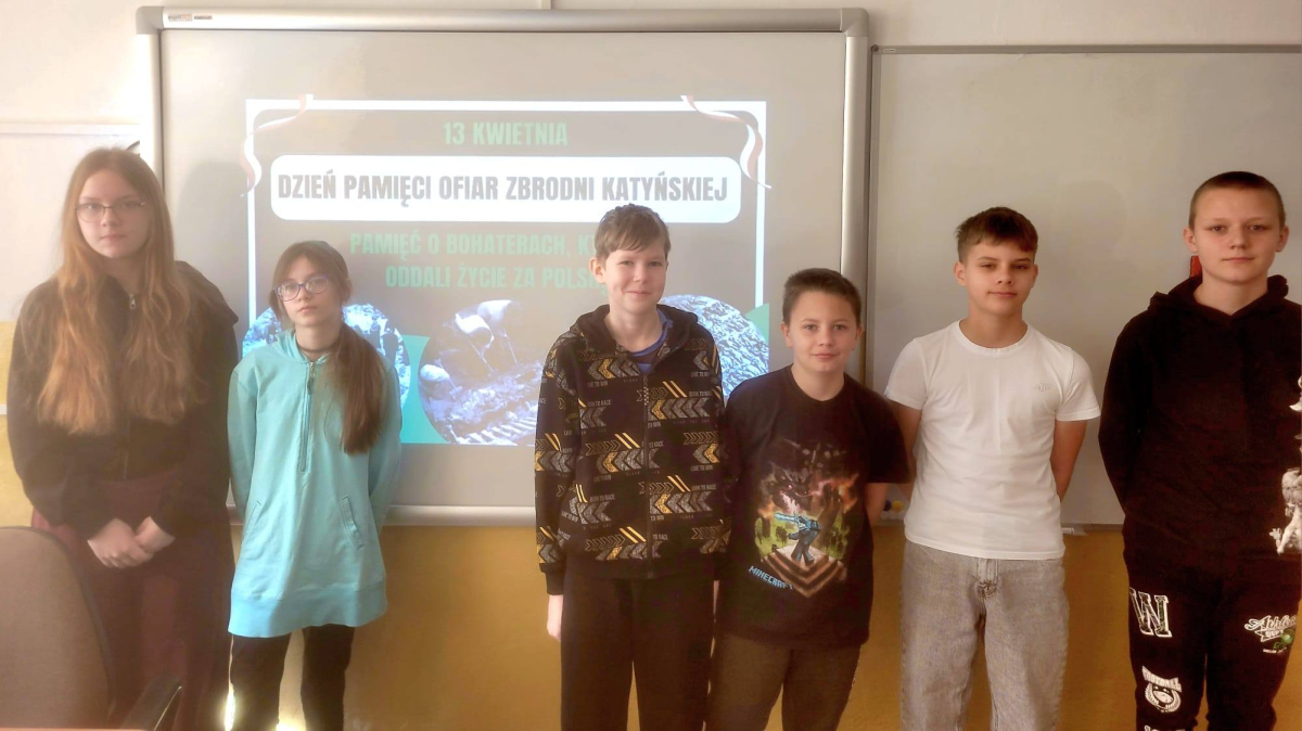 13 kwietnia to Narodowy Dzień Pamięci Ofiar Zbrodni Katyńskiej. Pamięć o ofiarach zbrodni katyńskiej uczczona została w naszej szkole podczas lekcji historii. Uczennice Wiktoria Berg, Wiktoria Pac, Aleksandra Wenda, Oliwia Sławska oraz Wiktoria Radomska przygotowały i poprowadziły zajęcia o masowym mordzie polskich elit dokonanym przez sowieckie NKWD wiosną 1940 r.