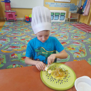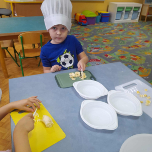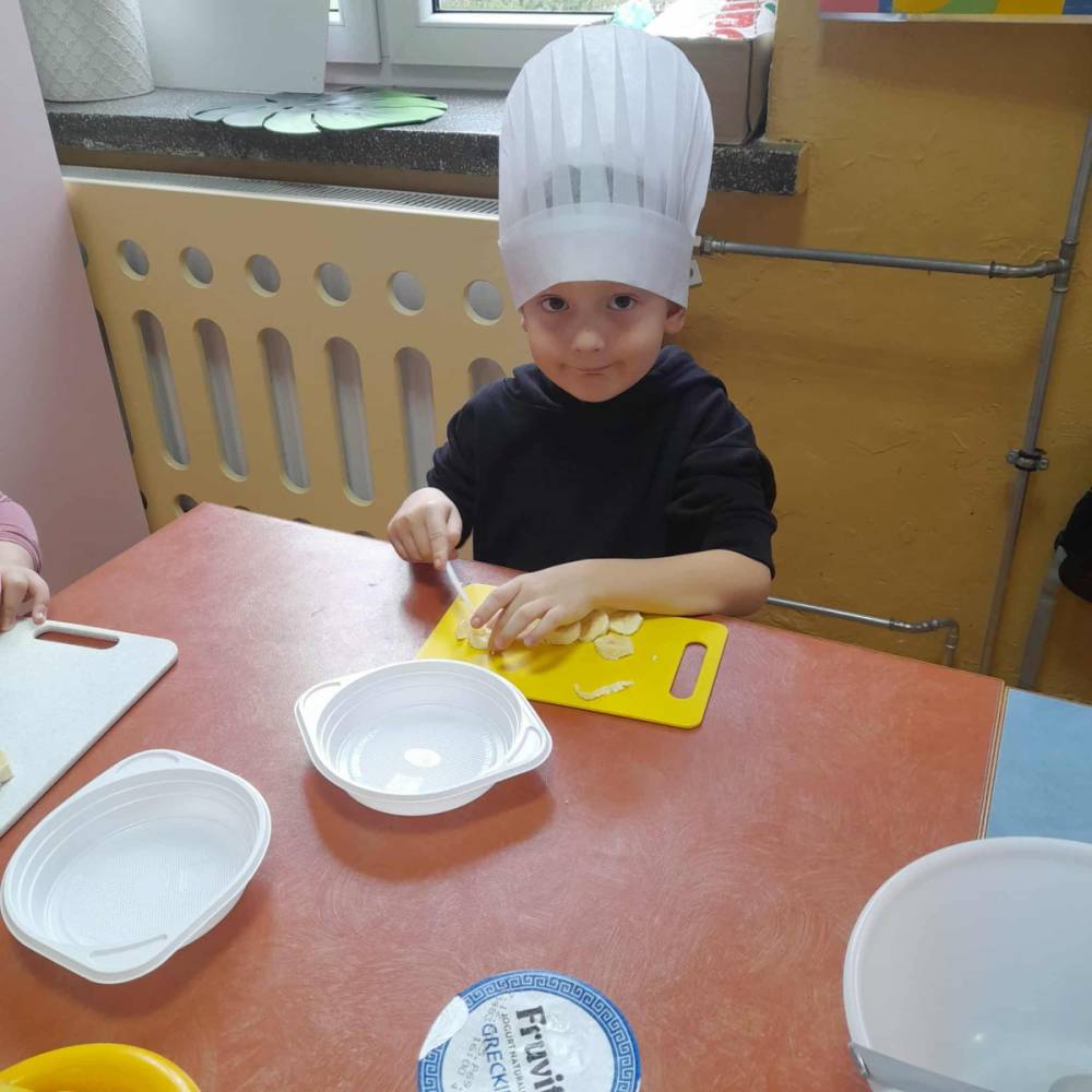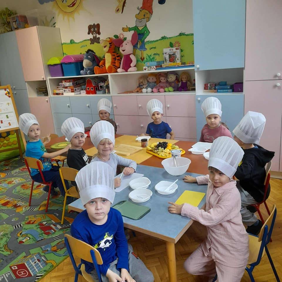 Dzieci z oddziału przedszkolnego miały wyjątkowo smaczny i pouczający dzień. Najpierw uczestniczyły w rozmowie na temat zdrowego odżywiania oraz zasad prowadzenia zdrowego stylu życia. Podczas zajęć dowiedziały się, dlaczego warto sięgać po naturalne produkty, unikać nadmiaru cukru i dbać o codzienną aktywność fizyczną. Aby lepiej zrozumieć poruszane zagadnienia, przedszkolaki obejrzały również tematyczny film edukacyjny, który w ciekawy sposób przedstawił korzyści płynące z jedzenia warzyw i owoców. Po części teoretycznej przyszedł czas na praktykę. Dzieci z zaangażowaniem przystąpiły do przygotowania zdrowej sałatki owocowej. Kroiły i mieszały kolorowe składniki, ucząc się przy tym współpracy, samodzielności oraz zasad higieny. Efektem wspólnej pracy była pyszna, kolorowa sałatka, którą wszyscy z apetytem zjedli. Zajęcia nie tylko dostarczyły dzieciom radości, lecz także utrwaliły ważne nawyki związane ze zdrowym odżywianiem — umiejętności, które z pewnością zaprocentują w przyszłości.